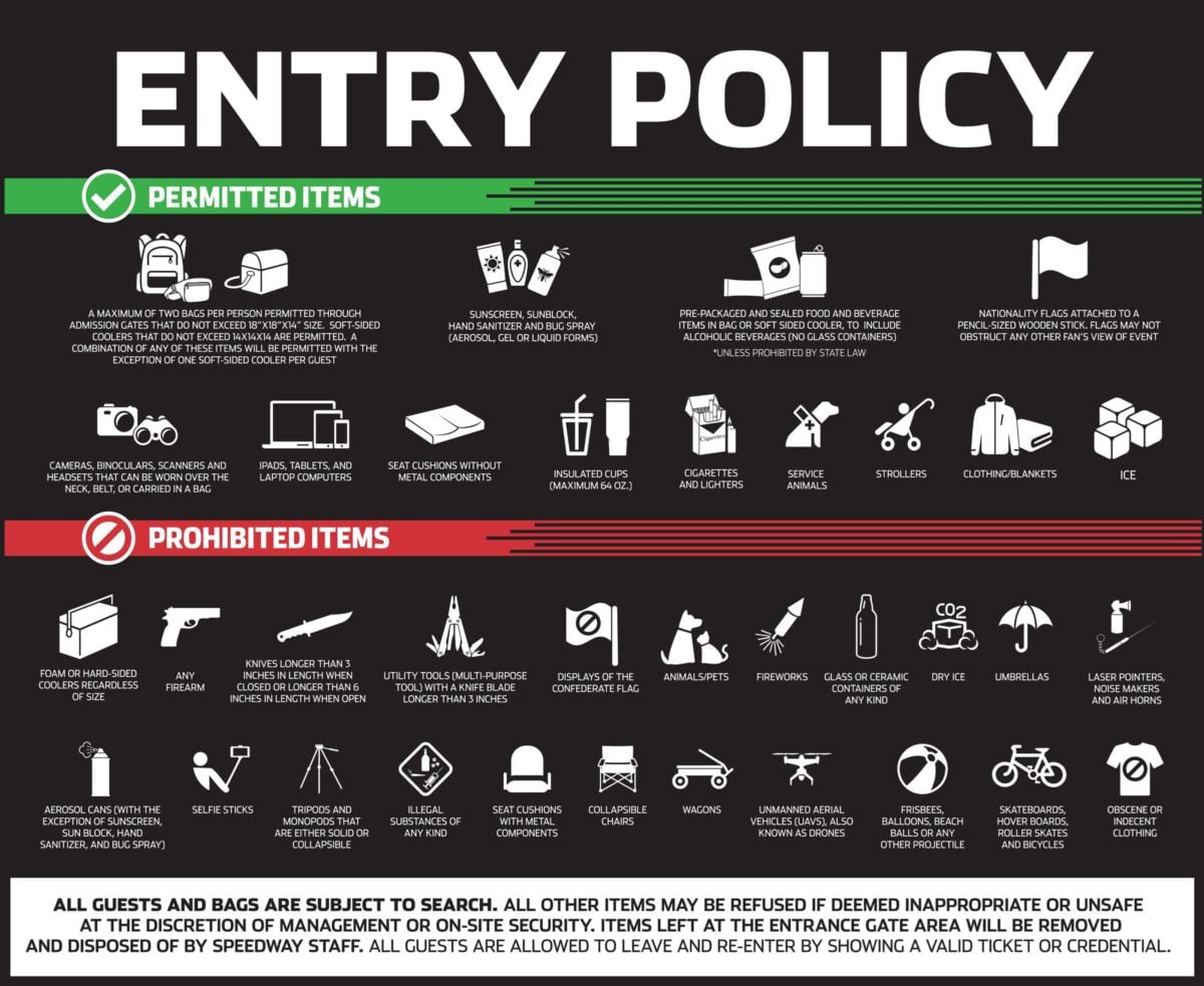 Prohibited items that are discovered during security inspections at the Speedway entrances must either be returned to the owner’s vehicle or discarded. Unlawful items that are discovered during security inspections are subject to confiscation and the person in possession of those items is subject to arrest. Any prohibited item discovered inside the Speedway is subject to confiscation.