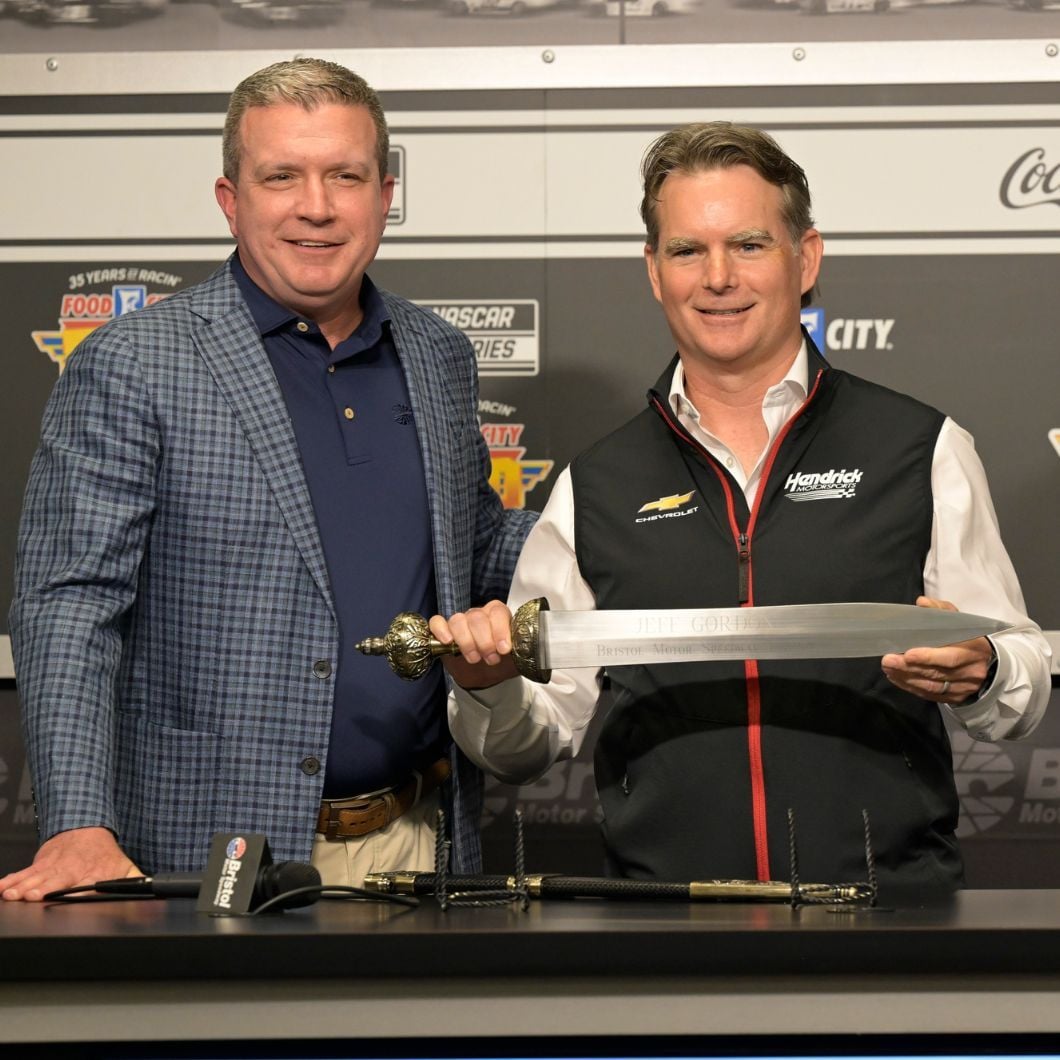 “First of all, thank you so much Jerry and everybody at Bristol Motor Speedway,” said Gordon upon receiving the engraved sword. “This has always been one of my favorite tracks to be a part of as a driver. Just even walking here, every time I walk in here, I am in awe and have such great memories. The (BMS Cup) trophy alone is special, and to now have my own sword is great. I actually have one from that special weekend last year (with Kyle Larson), so we wanted to remember it. But it wasn’t my own, so this is really special and is going in a very special place in my office, or my son might take this one.”