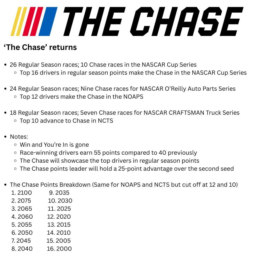 Gone is the “win-and-you’re in” provision that governed qualification in the elimination Playoff format in use from 2014 through 2025. Under the Chase format, the top 16 drivers in points will compete for the series title irrespective of the number of regular-season victories they accumulate.