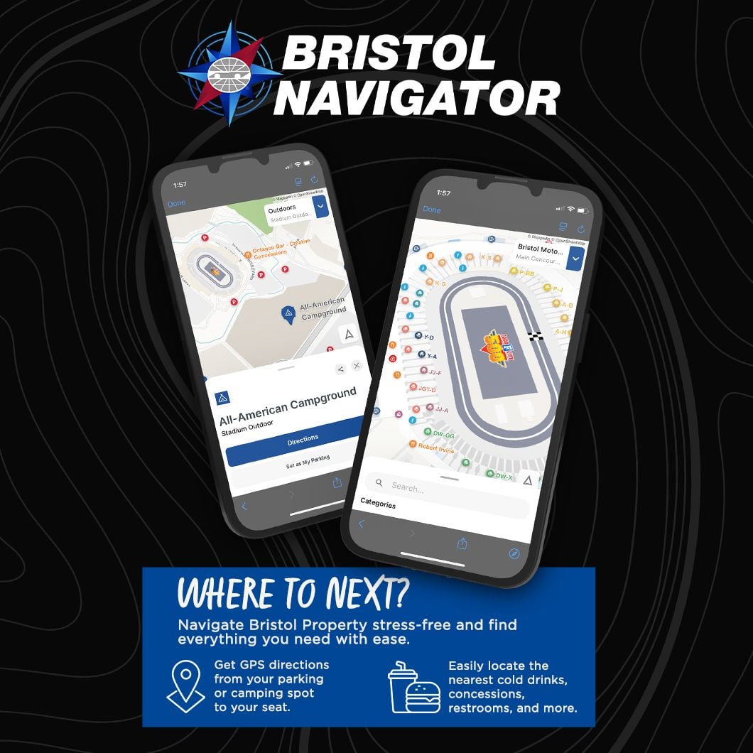 The GPS Navigator for Bristol Motor Speedway will allow fans to view a digital map of the BMS property on their digital device that will provide them with walking directions to specific destinations on the campus like ticket booths, specific attractions within the BMS Fan Zone, the Food City Fan Zone Stage presented by Coca-Cola Zero Sugar, the Speedway World Souvenir Shop, specific concession stands through the concourses, the T3 Vodka 360 Bar, and all of the BMS Courtesy Shuttle pickup and drop-off locations.